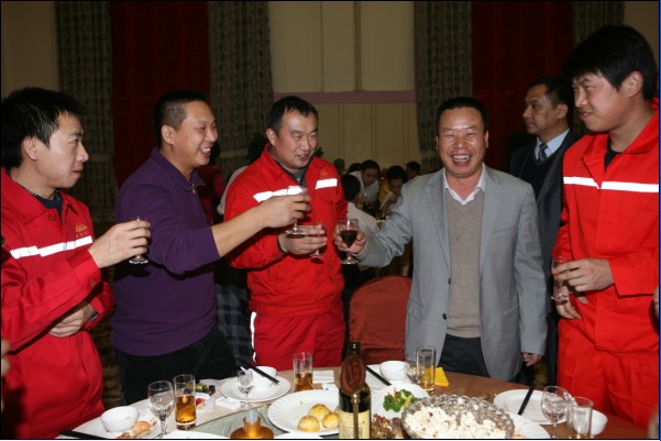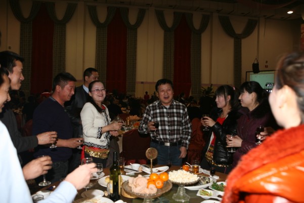有句古话叫“无酒不成席”,今天更是如此。平时要上班,要开车,酒是不能喝的,今天有了开怀痛饮的机会,又逢如此高兴的日子,那兴奋劲儿就不必说了。秦总、常总、王总一桌一桌的敬酒,各种感谢和祝福的话语表达了领导的深切关怀,走一桌就坐下来聊一会儿,聊这一年的付出,聊这一年的困难,聊这一年的收获。公司其他领导也一一到各桌和员工们喝酒,带去问候和祝福。员工们的互敬当然更热闹,整个大厅觥筹交错,欢呼声不绝于耳。