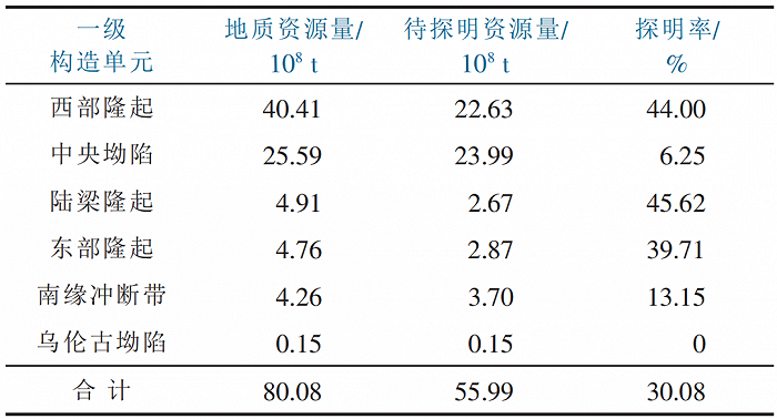准噶尔盆地一级构造单元常规石油资源量分布统计(来自文献《准噶尔盆地石油地质条件、资源潜力及勘探方向》)